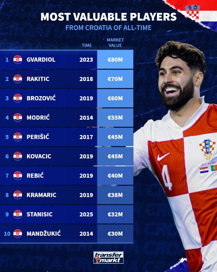 克罗地亚球员身价排行榜:格瓦迪奥尔贵过拉基蒂奇的魔法提示_英超直播